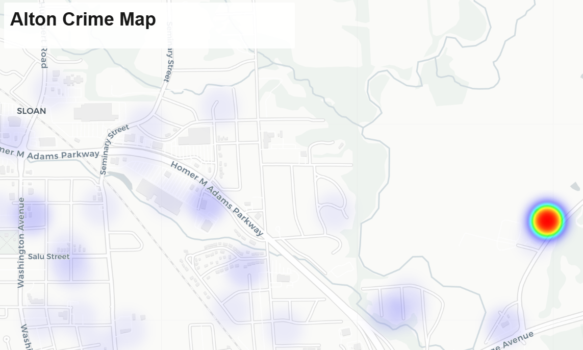 We created this crime map as a tool to visualize the relationship between violent crime and spatial injustice. It is a heat map of crimes reported in Alton for 2020-2024 using Illinois State Police crime records. The crime map has the potential to foster greater awareness of crime trends within the Alton community, empowering residents to make informed decisions about their safety. By identifying high-crime areas, the map can serve as a resource for neighborhood watch groups and encourage collaboration among residents to address local concerns.